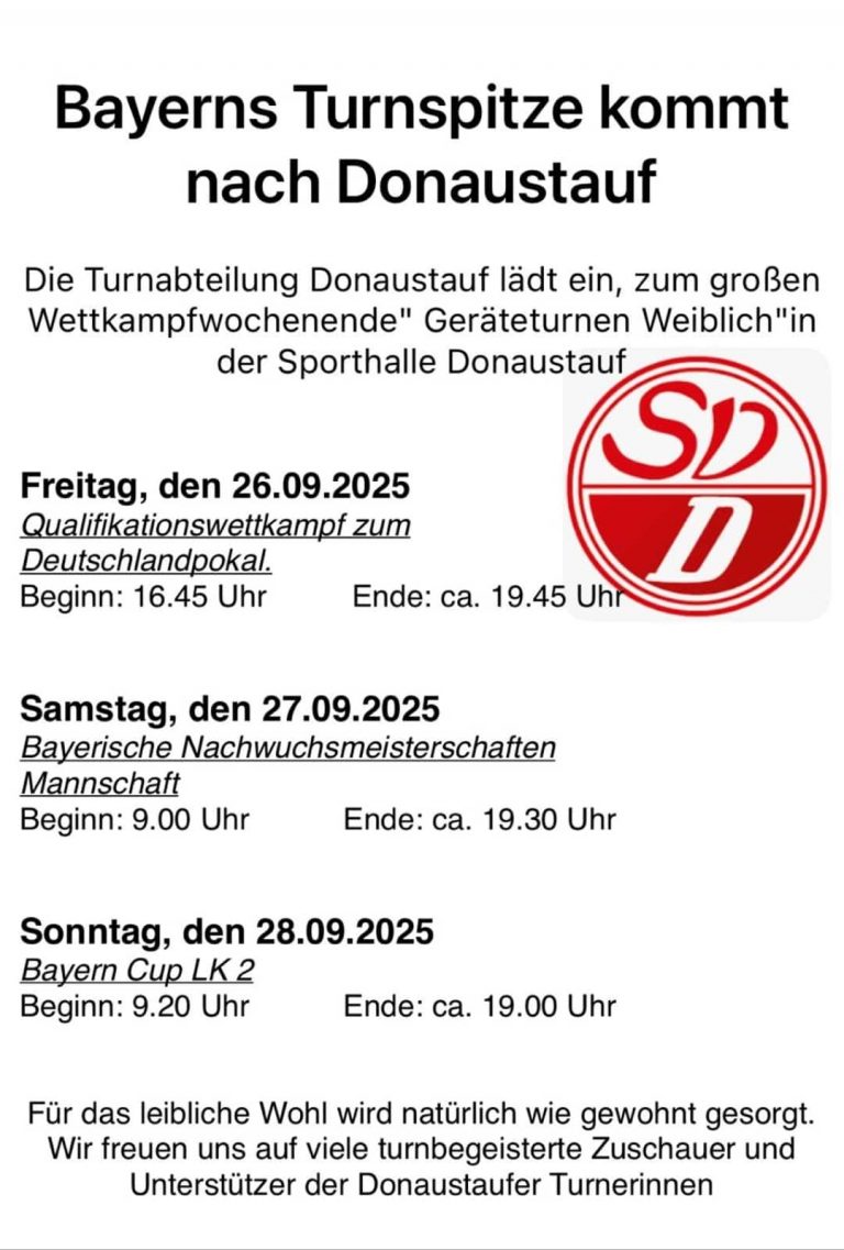 Bayerns Turnspitze kommt nach Donaustauf Die Turnabteilung Donaustauf lädt ein, zum großen Wettkampfwochenende Geräteturnen Weiblich in der Sporthalle Donaustauf Freitag, den 26.09.2025Deutschlandpokal.Beginn: 16.45 UhrEnde: ca. 19.45 Uh Samstag, den 27.09.2025Bayerische […]
