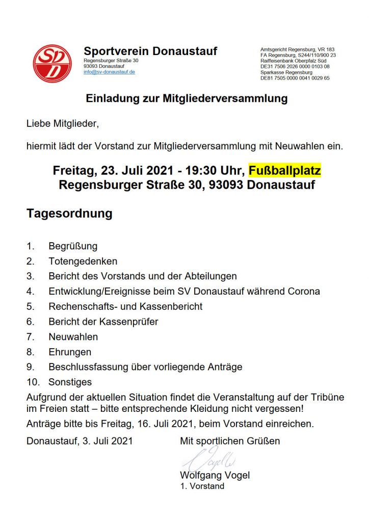 Einladung zur Mitgliederversammlung Liebe Mitglieder,hiermit lädt der Vorstand zur Mitgliederversammlung mit Neuwahlen ein.Freitag, 23. Juli 2021 – 19:30 Uhr, Fußballplatz Regensburger Straße 30, 93093 Donaustauf